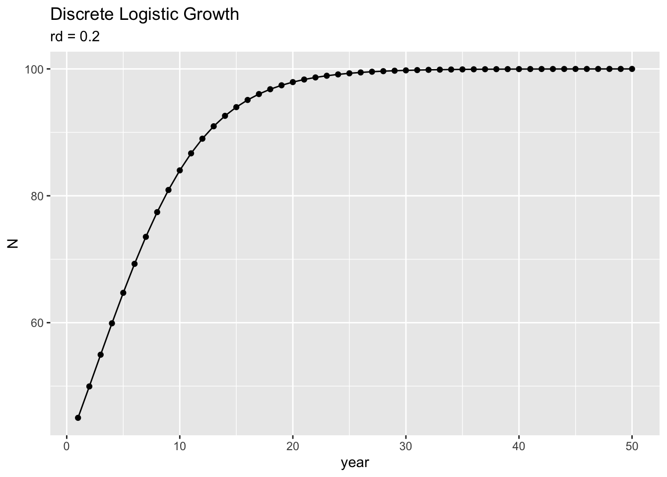 N[1] <- 45Select a value of \(r_d\) and use a for-loop to project the population through time, from one year to the next.