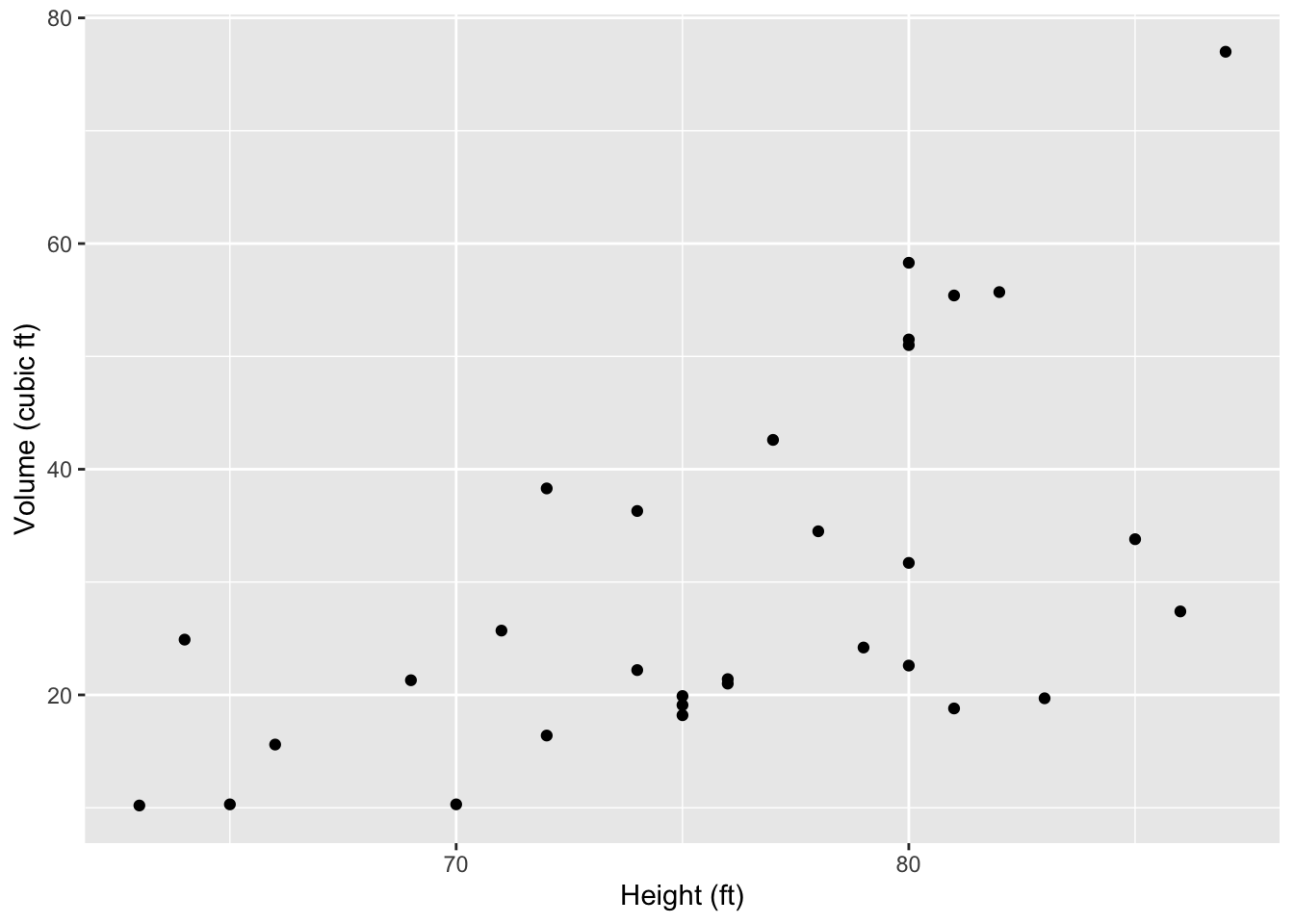 ggplot(data = trees, aes(x = Height, y = Volume) ) +